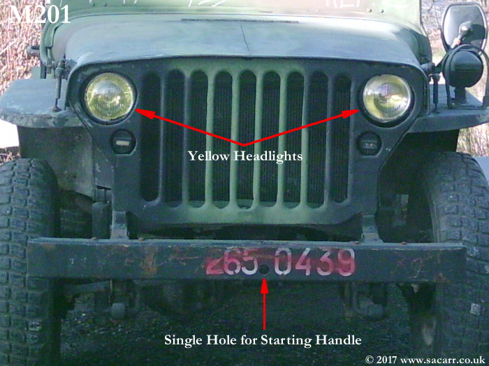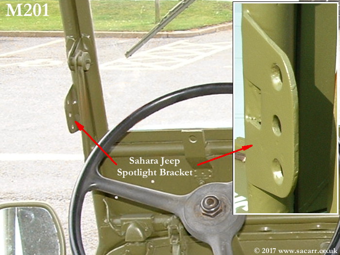 Post war, some M201 Jeeps were modified for use in the Sahara. One modification was to fit a bracket to the windscreen frame onto which was mounted a powerful spotlight. Only Jeeps converted for Sahara use had this bracket and spotlight. However, because the French operated M201's, GPW's and MB's, it is possible that any of the three types of Jeep may be seen with the spotlight. However this would only be in post war French service, and never seen during World War Two. |