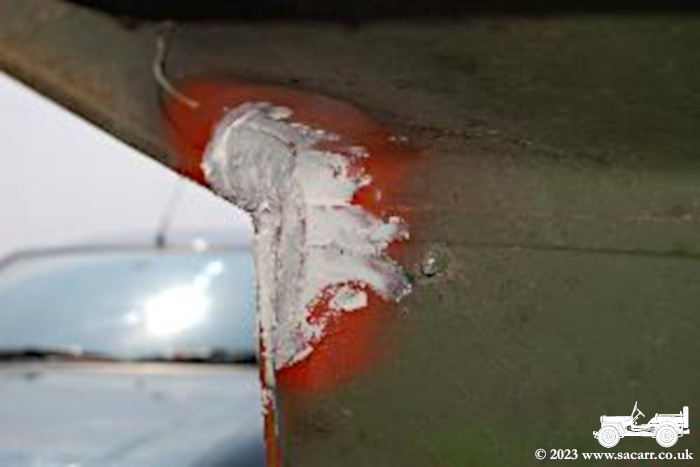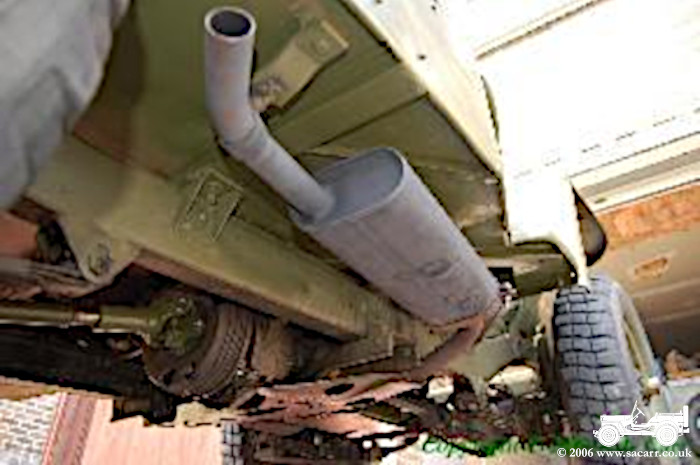 Areas on the underside of the floor needed rust treating. The exhaust was removed to do this and in doing so, I found three small holes which were welded up. The exhaust was then sprayed with some heat resistant paint. The floor was then rotary wire brushed to remove the rust, sprayed with red primed and then an olive topcoat sprayed. |