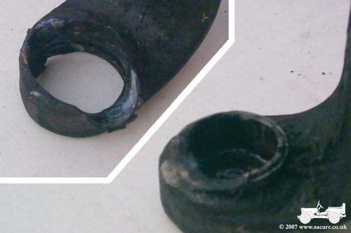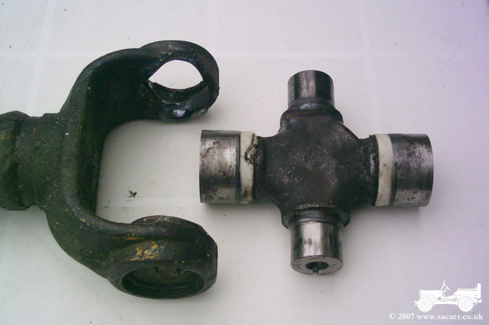 On the way to the Locomotion Railway Museum at Shildon over the Easter weekend, there was a loud bang below the jeep. It soon became apparent that one of the universal joint bearings in the rear prop shaft had destroyed itself, despite only recently being re-greased. I suspect that the circlip, holding the bearing in place, came out allowing the bearing to fall out of the end of the yoke. Replacement shafts come as a complete unit ( see below right ), but only requires eight bolts to be removed to replace it. |
