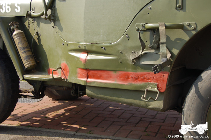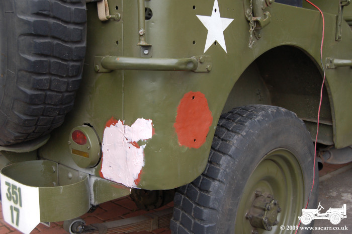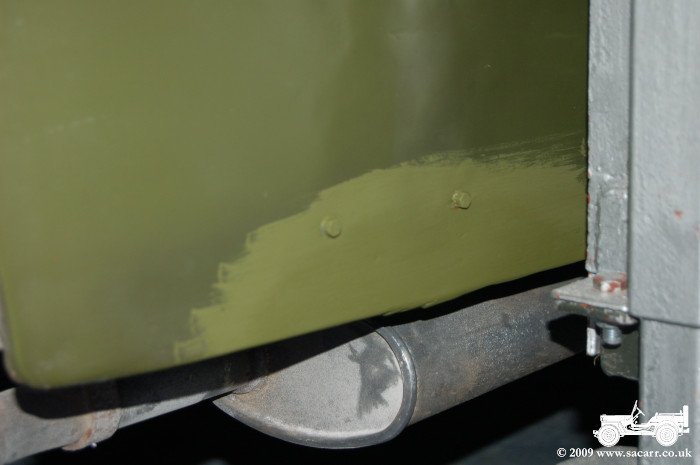 For some time I've noticed a row of rust blisters on the paint behind the axe and shovel. It was a nice day today and while I was tinkering with other odds and ends on the Jeep I decided it was time to deal with them. As with previous rust treatments, the affected area was ground out with a wire brush, red oxide primed, filled level, re-primed and the final colour coat painted. The axe and shovel were also cleaned and woodwork waxed ready for re-fitting once the paint has hardened.