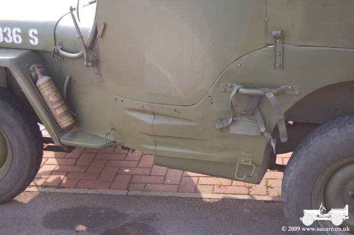 I fitted the new Jerry Can Strap to the back of the drivers seat today. The upper 'Footman Loop' is held to the seat by screws tapped into the frame. The lower 'Footman Loop' is bolted through the angled section of the floor. We once again have an extended range when not towing the trailer, without compromising the airfield look of the Jeep. |