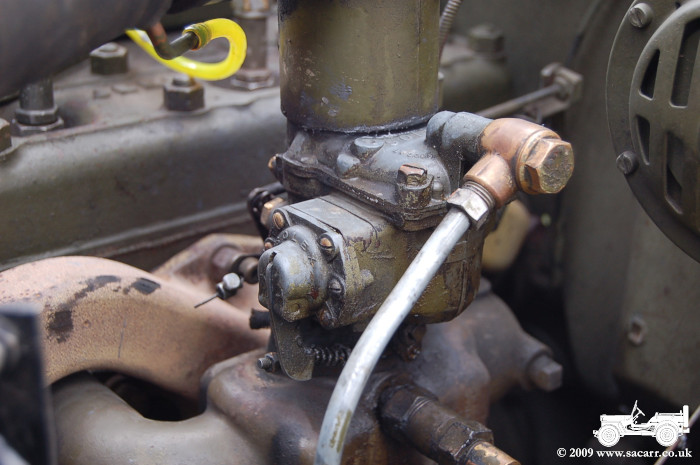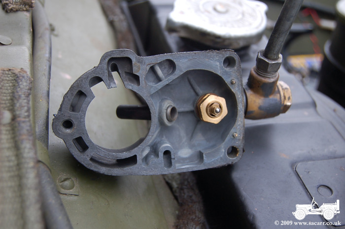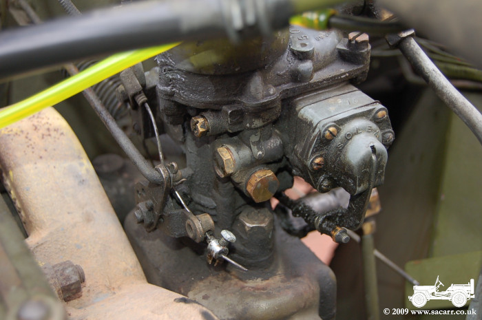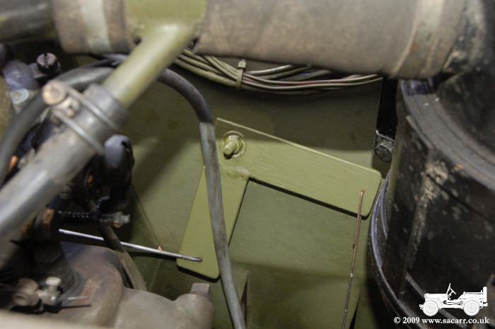 April 4th '09 - Engine Primer Modification If the Jeep hasn't been run for a while, the engine needs a prime before starting, otherwise the batteries and starter get un-necessary use pulling the fuel through. Previously I had fitted a welding rod through the hole in the primer arm, and the other end hung over the horn bracket. With the hood open I could pull this wire. Reaching this wire is impossible when the doors are fitted. Today I made this little bellcrank modification. The steel bellcrank was welded up from scraps I had kicking around, and bolted through an existing hole in the fender. The original priming wire was cut short and fastened to one end of the bellcrank. |