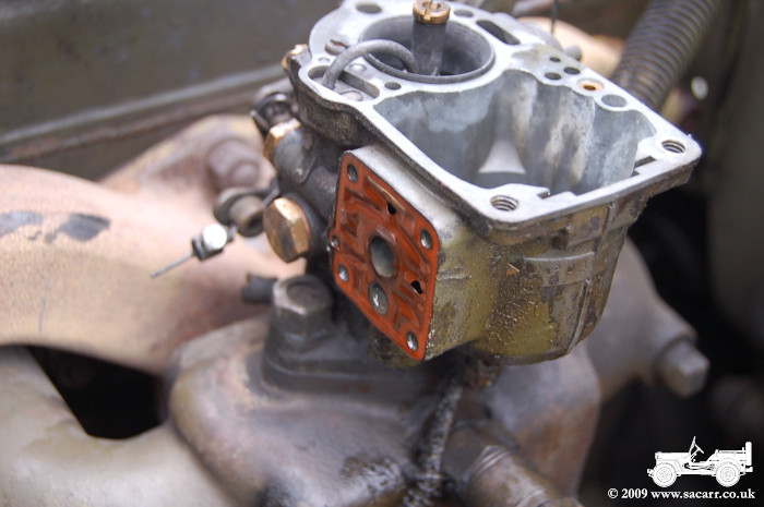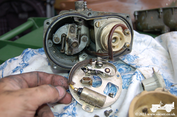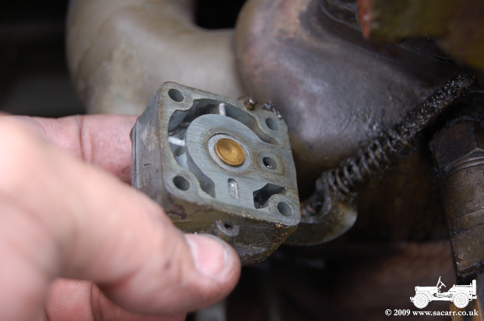 | The fuel pipe was disconnected from the fuel pump, and then the top of the carb removed to reveal the float chamber ( below left ). The float was removed and the bowl cleaned out of sediment. The cover plate had the one way ball valve checked. |