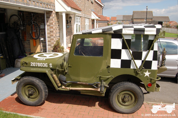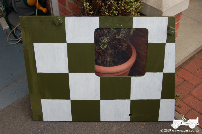 | To further enhance the Flying Control look to the Jeep, the rear sections of the door sets were also painted checkered today. This more resembles the 100th Bomb Group Follow Me Jeep in my 100th archives photo album. | ![]() |