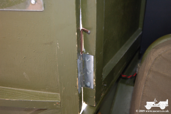 At last weekends event at Ingleton, we spent some of the time with the front section of the doors unscrewed when it was warm, but it was a pain screwing them back on when it rained. I decided to make them quick release so if I was driving with them removed, they could be quickly re-fitted. To achieve this, I filed off the end of the hinge pin, and replaced it with an 'L' shaped pin that would allow it to be easily drawn out of the hinge. The parts of the hinge can now remain screwed to the doors, while the pin can be easily withdrawn and replaced along with the doors. |
