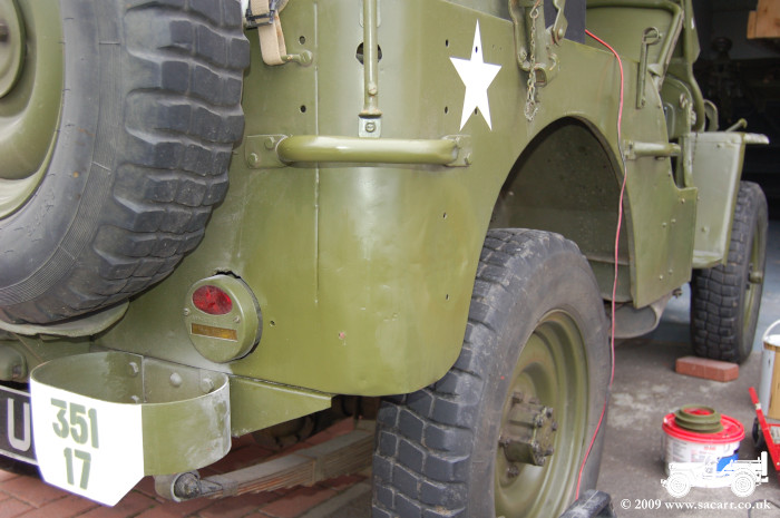 What I expected to be a quick job actually took five hours. The bolts holding the old reflectors on were rusted solid and had to be ground off with the angle grinder. The bodywork behind had lots of surface rust and was very uneven where it had been pulled in at the welds, so after the rust was removed and the surface red oxide primed, it was filled and sanded to a more even level so as not to distort the reflectors when they were bolted up. It was primed once again before a final brushed coat of green. In the summer when it is warmer, I'll give the area a light sand and a sprayed coat of green. Once the paint was dry, the new reflectors were bolted on.
