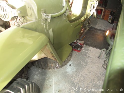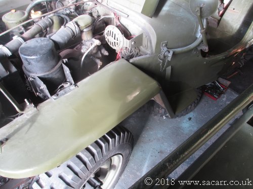February 20th - Bodywork Painting Finally in late February, the weather was just warm and dry enough to allow painting. The Jeep has been sitting in primer since November after completion of the welding work. It still wasn't tropical outside, but warm enough to spray with the garage door open, after which it was closed and the Jeep left to bake with a heater in there. After it had started to go touch dry, I draped some old bed sheets a little above the painted areas to form a tent. The heater was then left under the tent to keep the warmth from going straight to the garage roof. I'll leave it several days to fully cure before I start refitting the tank, seat and steering wheel. |