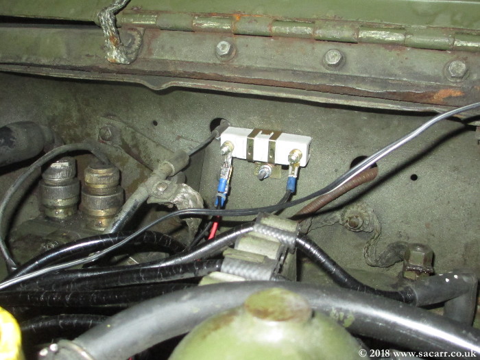 Over the last few days, I've continued to test start the Jeep. Some days it started first go on the button, other times it turned over but just wouldn't fire. There was obviously an intermittent fault somewhere in the ignition system, but there weren't many places left to look. I had a gut feeling and checked the ballast resistor with my multi-meter. No problems previously, but this time it varied from resistance to open circuit. I did a brief test by using a jumper wire to bypass the resistor and the Jeep burst straight into life. Switched straight off, I then unbolted the resistor from the firewall to take a closer look. It was fractured, and sometimes made contact while other times it didn't. I'm wondering whether the load when working, warmed and expanded the metal, ensuring good contact, but when I switched off and it cooled and contracted, broke the circuit causing the starting problems. Anyway, two replacements have been ordered. |