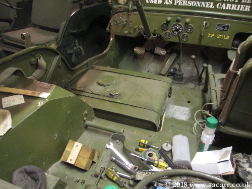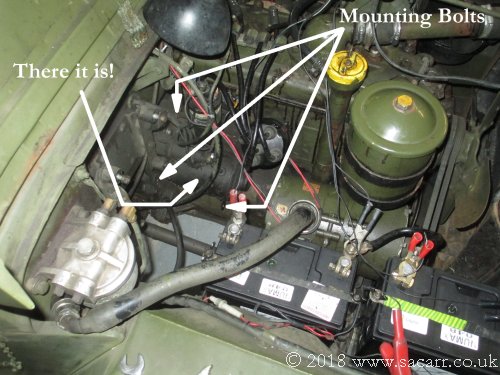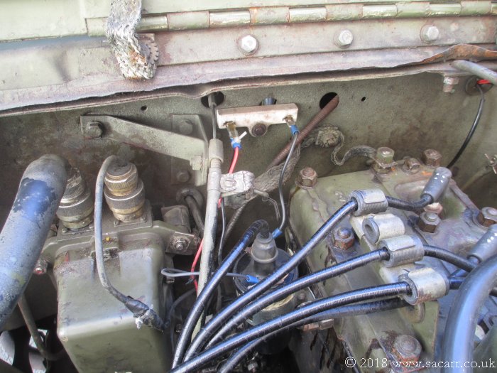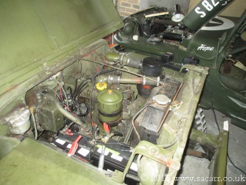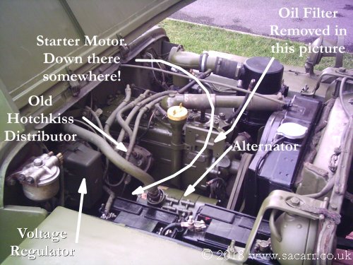 ----- March 18th - Starter Motor Overhaul The new batteries still didn't improve the starting problems, with the starter motor struggling to turn the engine past compression when the engine was cold. There wasn't much else to check other than the starter motor. I was concerned I was going to have to splash out £285.00 for a new starter. Whether the motor was repaired or replaced, it was going to have to come off the Jeep. Hotchkiss crammed a lot more equipment into the rear corner of the engine bay, over the starter. The coil, voltage regulator, distributor, rear battery and alternator all made access difficult compared to the Ford or a Willys Jeep. After a struggle, I got the Jeep started and warmed through. This would hopefully allow starting via the hand crank to put the Jeep back in the garage, as I didn't know how long I'd be messing around with the starter motor. The first thing to be removed was the battery leads,