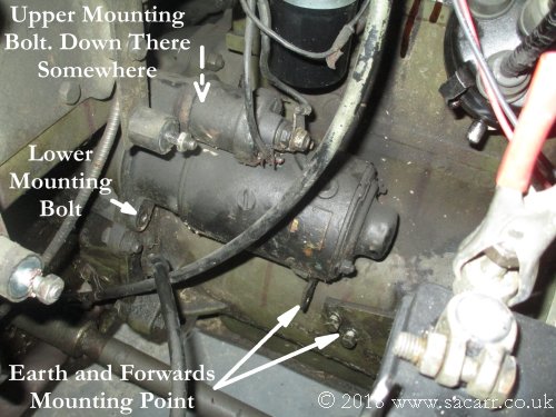With that out of the way, the starter could be seen. The various cables to the starter and solenoid were labelled and then removed. The mounting bolts were next, but still difficult to reach with spanners of sockets. |