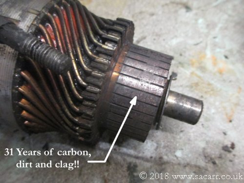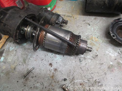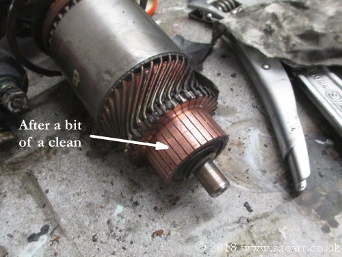 After unfastening further bits, circlips and pins, I finally got the thing apart. That revealed a very dirty commutator. I suspect the starter hadn't been serviced since the French Army engine rebuild in 1987. The windings appeared to be ok, and there was plenty of life in the brushes, but the commutator really needed attention. 31 years of crud had built up, effectively insulating the contacts. That prevented the power going to the coils, and so the motor wasn't able to turn over the engine. |