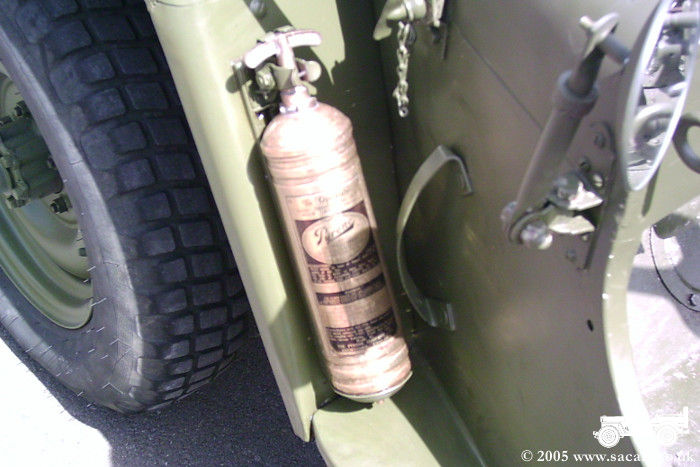 This Pyrene Fire Extinguisher and bracket found on Ebay. Since I have long legs and there isn't much space, it was mounted outside so as not to interfere with the clutch pedal. |