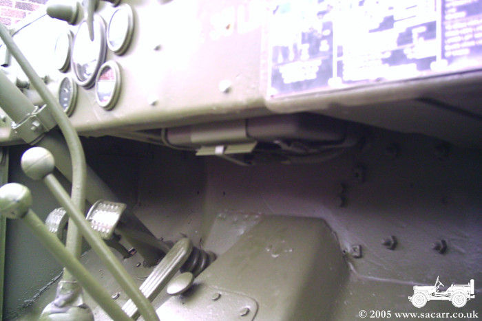 The bottom of the First Aid Tin bracket can be seen behind the dashboard and directly below the hand brake lever. A small strip of steel was added to the strap to lengthen it for the larger tin.