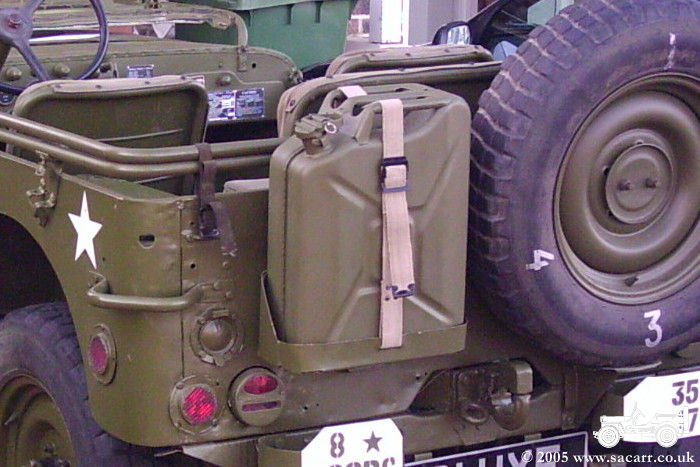 I bought a modern style Jerry Can from Ebay to use, rather than just an accessory. I didn't want an original that may leak. It was gloss green as purchased, but was re-sprayed to match the jeep.