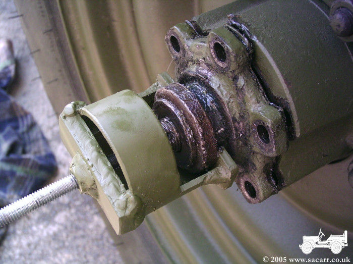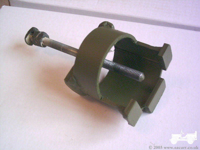 After trying to locate a Drive Flange Puller from several Jeep parts suppliers, and failing, I decided to make one myself. I found some steel tube a little bit bigger diameter than the flange on the drive flange. I had some flat steel bar, a long bolt and I had a tap and die set. All it needed after that was a welder and a few hour work to see the puller completed. To the right is the completed puller. The picture below shows the puller in place on the front drive flange, just starting to release the flange. The third picture is the exposed drive shaft and wheel bearing nut.