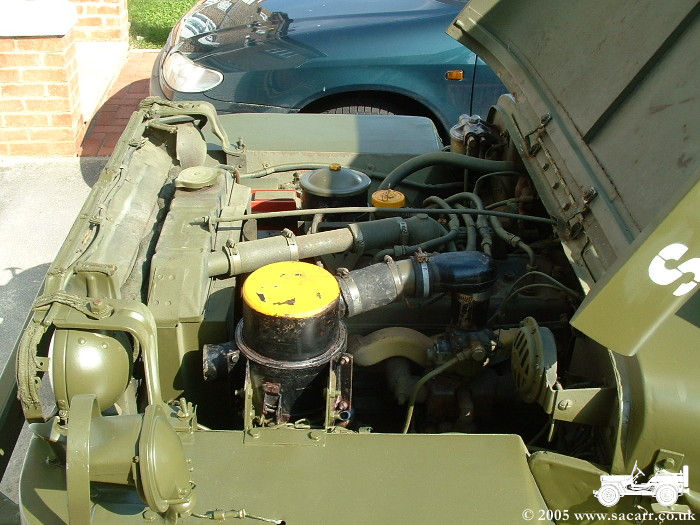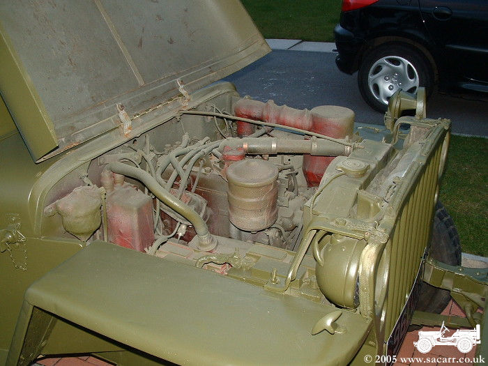 | When first purchased, the engine bay had no work at all, other than new batteries. Many components were covered in their protective coverings from the vehicles period of deep storage. Closer inspection revealed the engine to be a 1944 Willys unit. | |