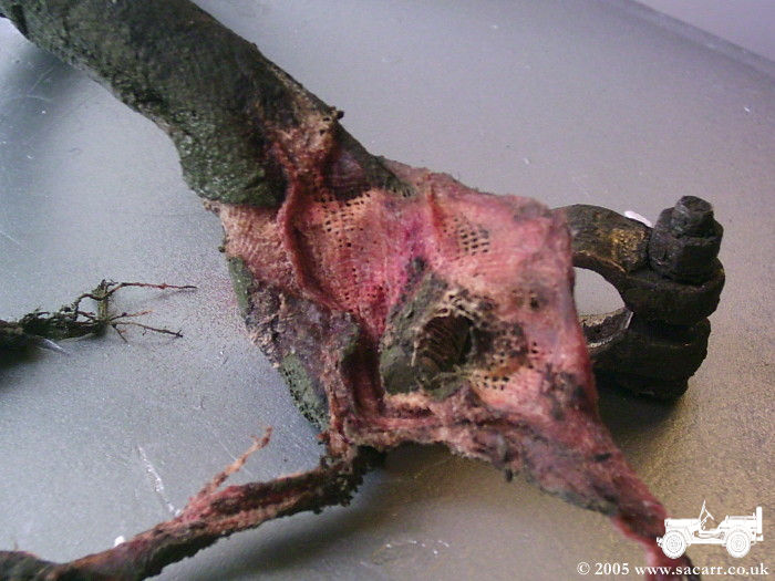 | All the components coloured red ( although some have green overspray ), were protected with a very open weave fabric, which was coated in a wax or grease. This is VERY sticky and a nightmare to peel off. A petrol rag is then needed to remove the remaining residue. | |