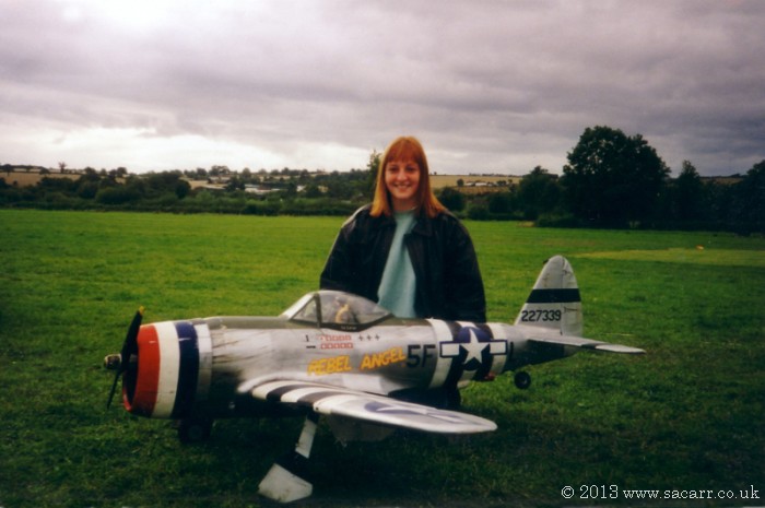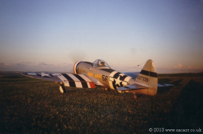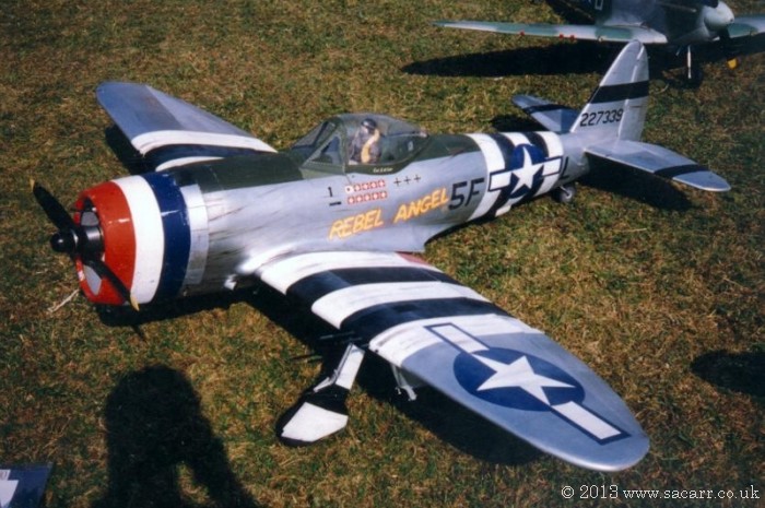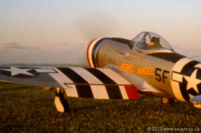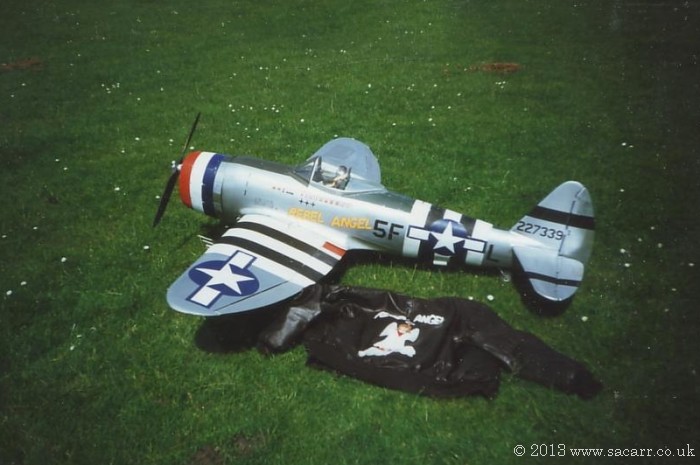 | P-47D THUNDERBOLT "Rebel Angel" The P-47 was rebuilt over the winter of '96/97 and was ready to fly in May at the Longhorsley show. The trusty old Zenoah 38 was destroyed in the crash, so the new P-47 was fitted with a spare 3w-40cc engine which gave it much more power. |
