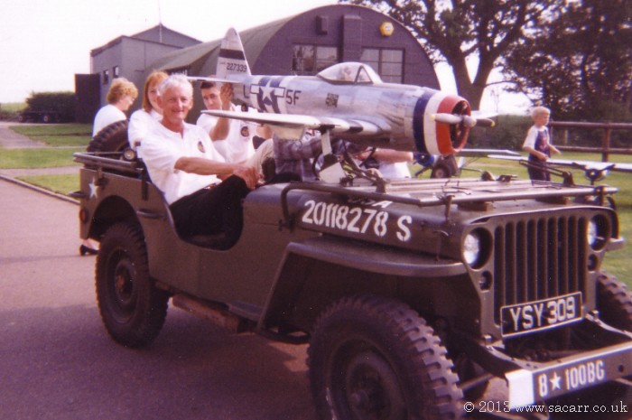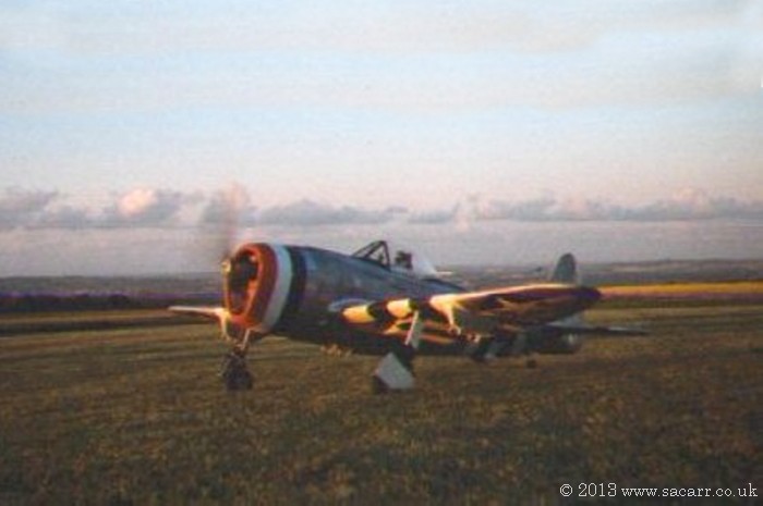 | For the 1996 season, the P-47 had a slight colour scheme change from the 78th FG at Duxford to the 353rd FG at Raydon. It was a short lived scheme as the P-47 crashed mid year while being flown by a friend, though the crash was not his fault. The aircraft suddenly rolled and pitched down, vertically into the grass at Cosford shortly after take off. At the time, the cause of the loss of control was unknown as the radio worked fine again afterwards. The wing, rear fuselage and tail survived. | |