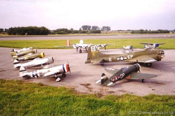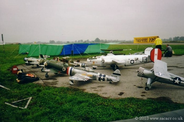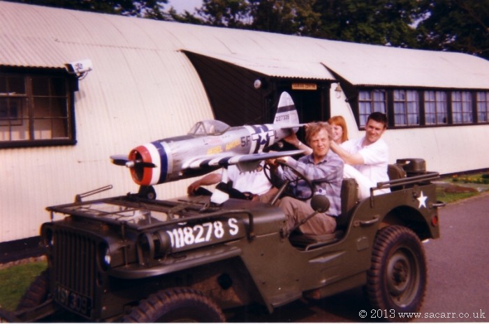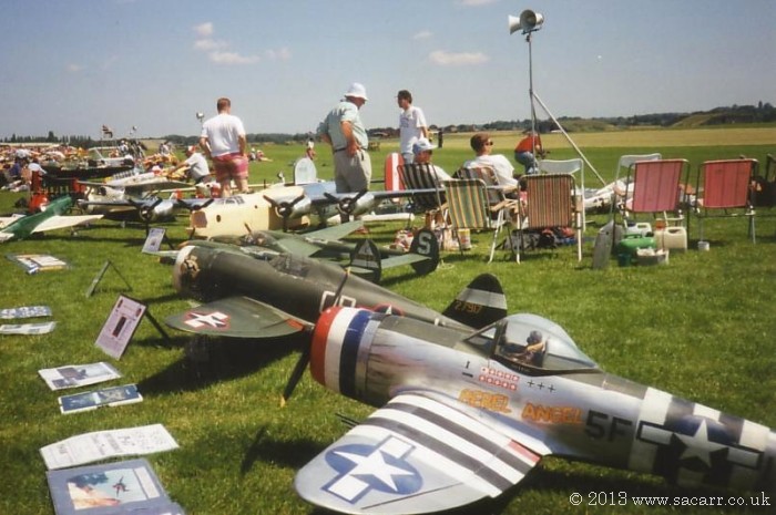 Close inspection of the radio system found a fracture in the signal wire leading to the two elevator servos, hidden inside the insulation. Pulling it this fracture caused all the servos to chatter ( causing the sudden roll and loss of elevator control ). The P-47 was rebuilt again in six weeks, and test flown at the former RAF Oakington ready for the show at Cosford the following week. |